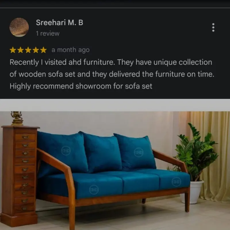 Based on 232 reviewsTrustindex verifies that the original source of the review is Google. I purchased a teakwood sofa from them online for my house inThane, Mumbai. The website is well designed and easy to order. They give regular updates about status of order on whatsapp. The wood is of very good quality and nicely designed. The polish finish is also good. The sofa size is good and is comfortable. The packaging was of very good quality. They use a softwood frame with screws over the box packaging to prevent damage in transport, hence u will need to arrange for carpentar to remove the frame and also dispose the frame. So, accordingly arrange for carpentar in advance as per delivery date. I would like to thank Mr.Rahul from Kochi office for all the support to ensure timely delivery. Mukundraj KenyTrustindex verifies that the original source of the review is Google. The craftsmanship is excellent.The finish,quality and attention to details is impeccable.Highly recommend this store. Chinchu BejoyTrustindex verifies that the original source of the review is Google. First, I was looking for some furnitures on the website, I decided to order some furnitures from their Shop (AHD). I was about to order only Cot. But ended up with 5 items (Wardrobe, Desk, Etc.) The furnitures are Excellent and Very Fair Prices. (Wide ranges of Design) The person Rahul, He was very polite and communicative. Helped to get those furnitures on the mentioned date, delivered to our home and helped get everything inside. Thanks a lot for your service. Gowtham RanjithTrustindex verifies that the original source of the review is Google. The quality and finishing are quite good, and the design is unique enough to stand out. It makes a great addition to our drawing room Sudipto BanerjeeTrustindex verifies that the original source of the review is Google. We are extremely happy we chose AHD furniture as we got very good products. Also, we got very good customer care support from their office. I would also like to thank manager Mr. Rahul, he is very supportive and given us the best service. Thanks, Cherian. Cherian SamuelTrustindex verifies that the original source of the review is Google. We got a corner sofa and a king size bed for the master bedroom. Both are of really good quality and made per our requirements. Our corner sofa got delayed by a few weeks since we asked for a style they were perhaps not very familiar with but they gave us a temporary sofa in the mean time. Rahul from the Kochi office was our primary contact, very good service and prompt in responses. He tried to help where he could to expedite/escalate. Would recomnend especially if you want to customize your furniture and are willing to wait for something unique!! narayanan p cTrustindex verifies that the original source of the review is Google. Good quality furniture and amazing designs . Teak wood furniture at a good price 👍🏻 T. T. ThomasTrustindex verifies that the original source of the review is Google. Beautifully designed sofa set with a clean, modern look and excellent craftsmanship. The cushions are firm and comfortable, and the wood finish adds a nice touch. Delivery was right on time and hassle-free. Very satisfied with the purchase! Merin MathewTrustindex verifies that the original source of the review is Google. Placed order for 2 customized cots (superking and King size).Satisfied with the purchase and quality. Final finish and design was exact to my specifications. Dedicated staff ensuring customer satisfaction. Rahul very convincing and helpful throughout the sale.Overall a good experience . sreekala suresh