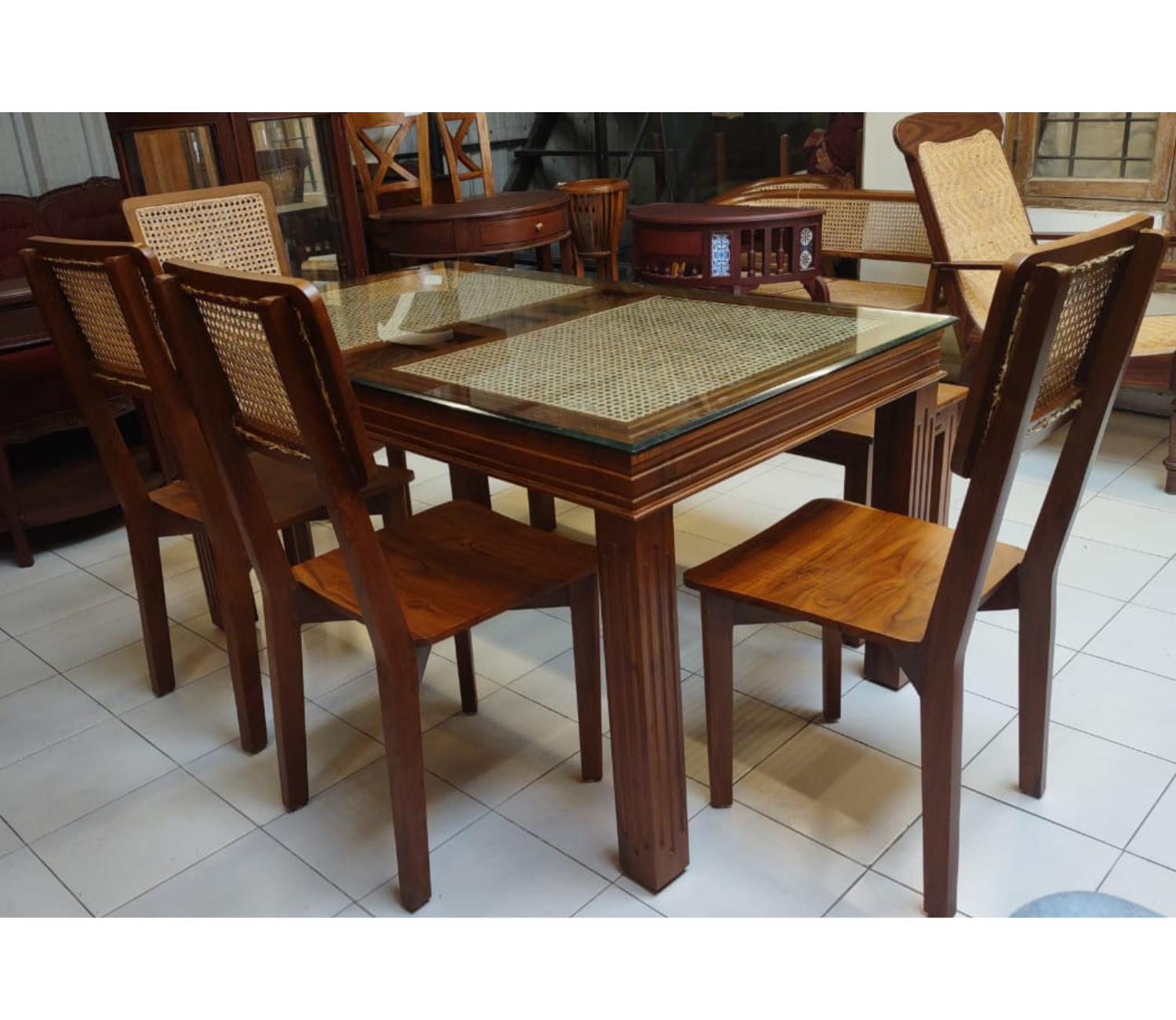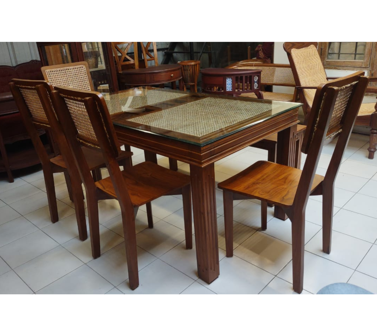 Art Glass Top Wooden Dining Table Set with Bench and 4 Chairs In Teak Wood