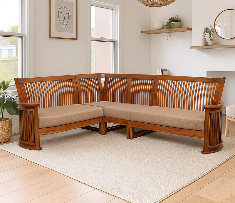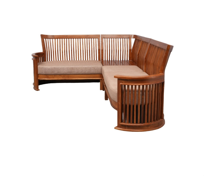 Luxe Teak Wood Wooden Corner Sofa, High Density Cushion With Spring, Customizable